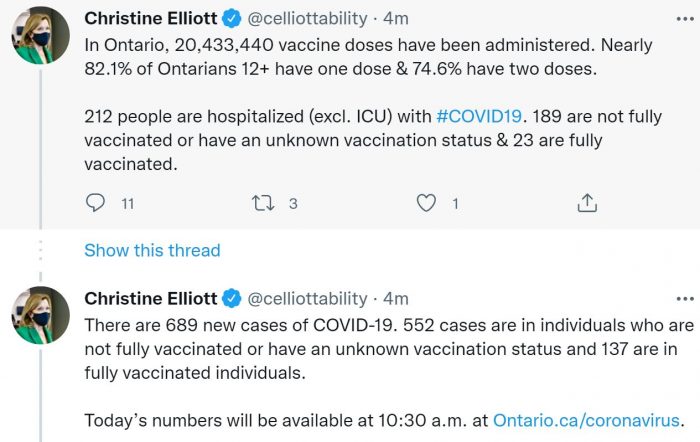 目前安省医院有212人因新冠感染住院(不包括重症监护室)。189人未完全接种或接种状况不明,23人已完全接种。