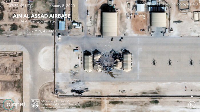 此前,伊朗对美国领导的驻伊拉克多国部队所在的伊拉克空军基地发射导弹,伊朗国营电视台称有80个“美国恐怖分子在导弹袭击中被打死,一些美军直升机和军事装备被损坏”,但没有提供如何得到这些资讯的证据。路透社声称取得美军的伊拉克阿萨德空军基地,遇袭前后的卫星图片,显示遇袭后的基地,有部分建筑物受损,多个相信是飞机库的建筑被夷为平地。