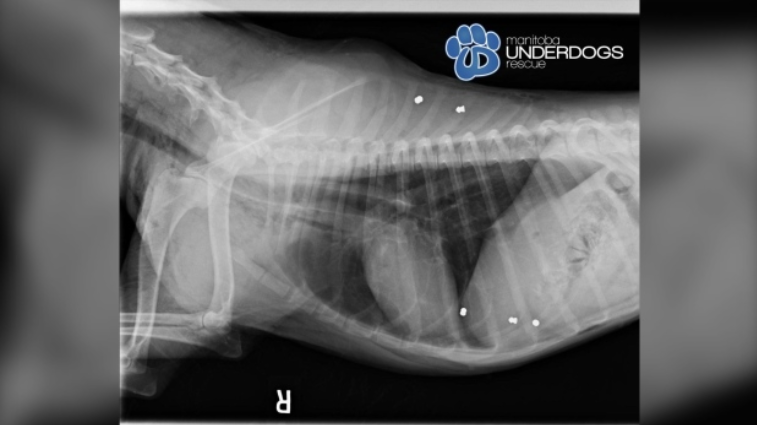 犬只救助机构Manitoba Underdogs Rescue表示,当时这条名为Greta的雌性狗,身上还有被其他狗咬伤的痕迹,被紧急送往宠物医院救治,结果发现还存在金属中毒问题,通过X光扫描,在牠身上发现6处被弹丸枪打中的痕迹,并在胃部留有大块金属。