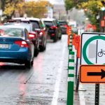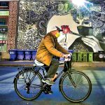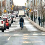 (■■蒙特利尔自行车人士戴着口罩穿过市中心街道。CBC)