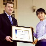 ■■时任外交部长白德(John Baird)于2012年3月8日,授予昂山素姬加国荣誉公民身分。 加通社资料图片