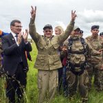 赖斯在跳伞教练陪同下,安全着陆,并神气地举起“V”字手势。他对记者说,感觉良好,可以再来一次。他说,这是向为国捐躯的阵亡士兵致敬的最佳方式。