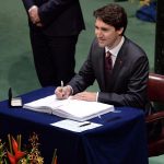 (总理杜鲁多于2016年4月在联合国总部签署《巴黎协定》。加通社)