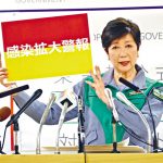 (■东京都知事小池百合子周三在记者会上,展示“感染扩大”警告牌。)