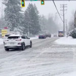 周四,一股猛烈的潮水涌向卑诗省海岸,导致间歇性降雪,以及随之而来的交通受阻。