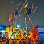 (■示威者以车辆和竹架阻塞印刷厂的入口)